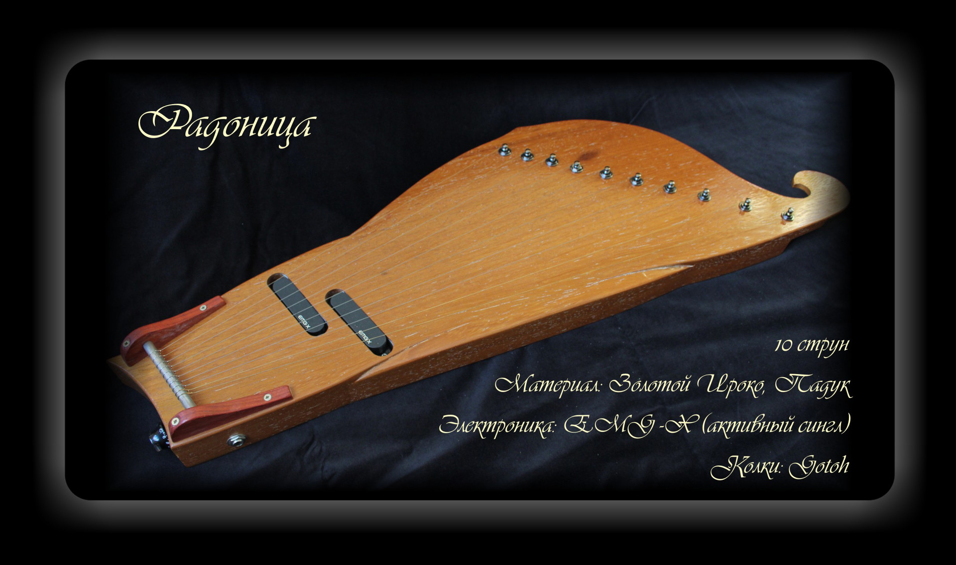 Материал: Падук, Дуб, Венге. Колки чёрные Gotoh. 2 активных сингла EMG-X. Пример звучания гуслей: https://youtu.be/6NqO8fUgh0A