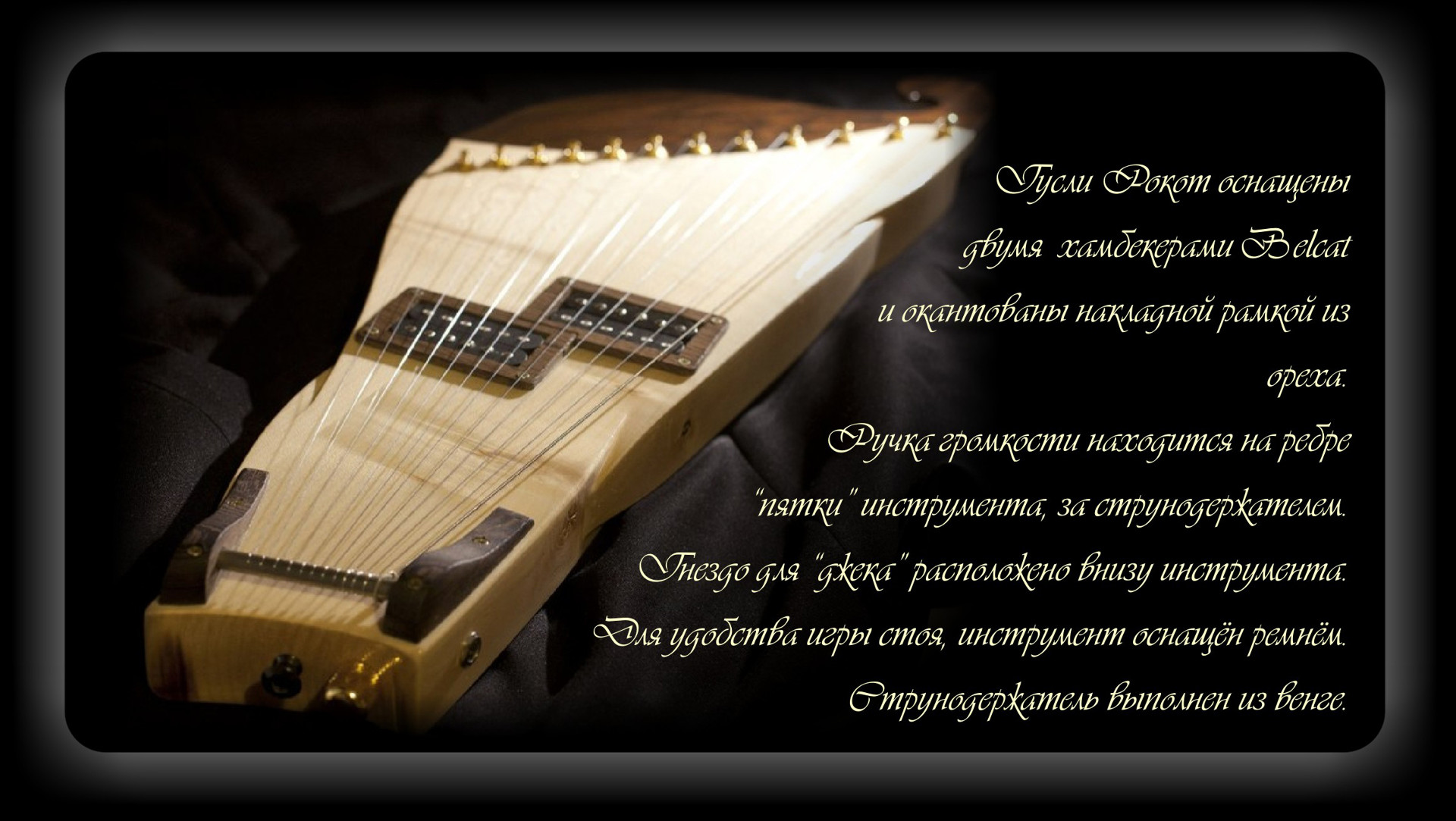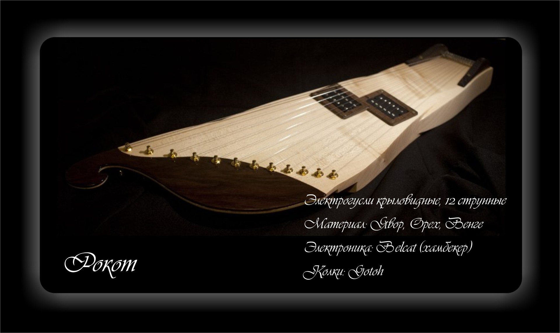 Материал: Уральская сосна, Яблоня, Клён. Колки с позолотой Gotoh. 2 хамбекера Belcat. Пример звучания гуслей: https://www.youtube.com/watch?v=khR0QJ3LrqI