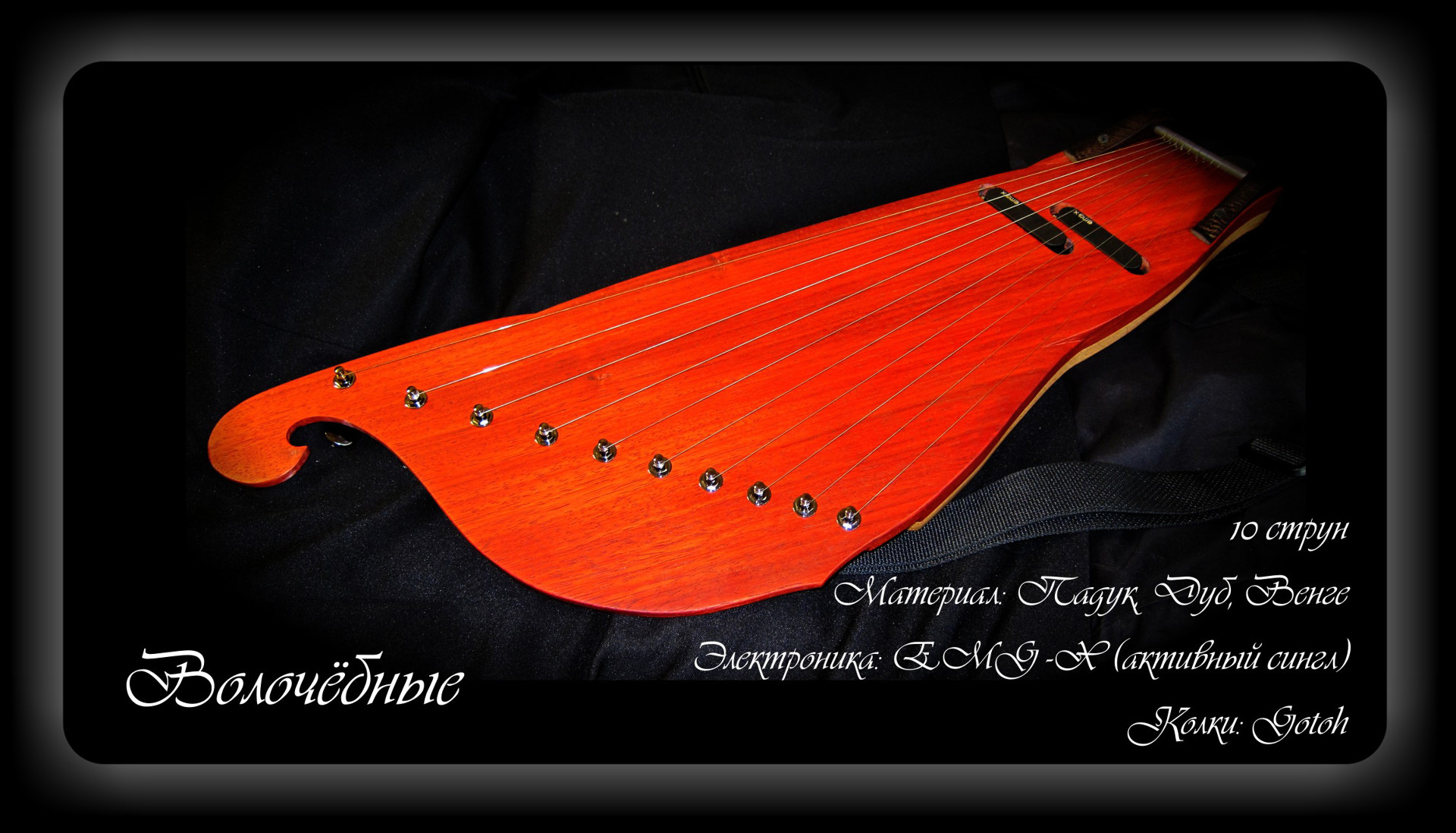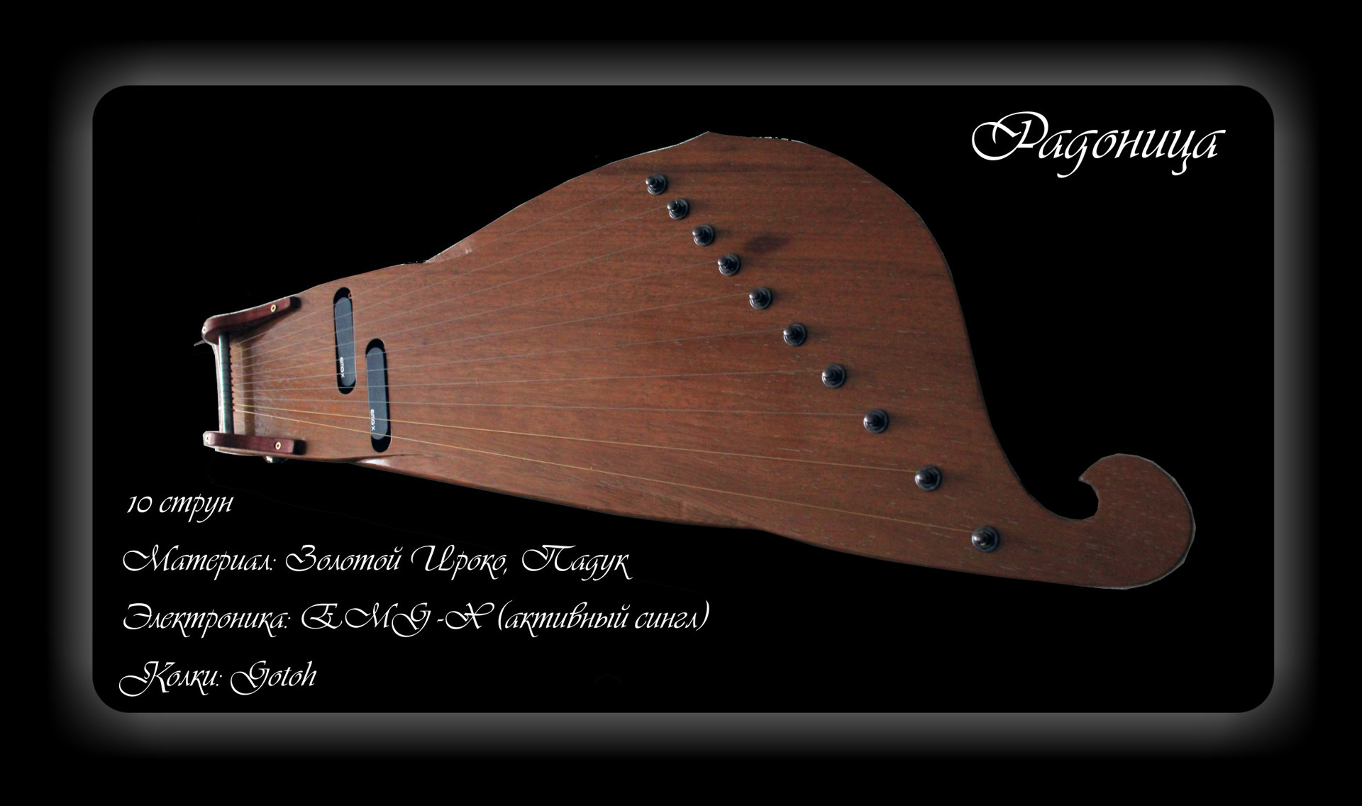 Материал: Падук, Дуб, Венге. Колки чёрные Gotoh. 2 активных сингла EMG-X. Пример звучания гуслей: https://youtu.be/6NqO8fUgh0A